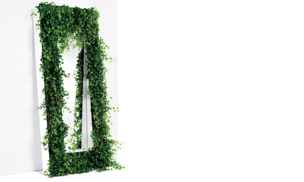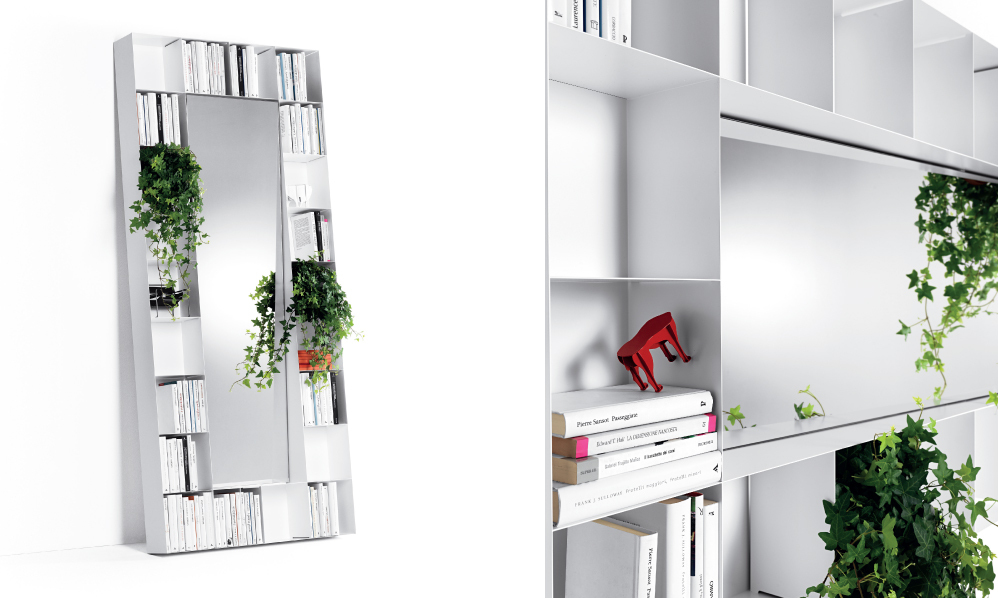 Uno specchio che diventa un giardino verticale oppure una libreria, grazie ai vani che lo incorniciano.