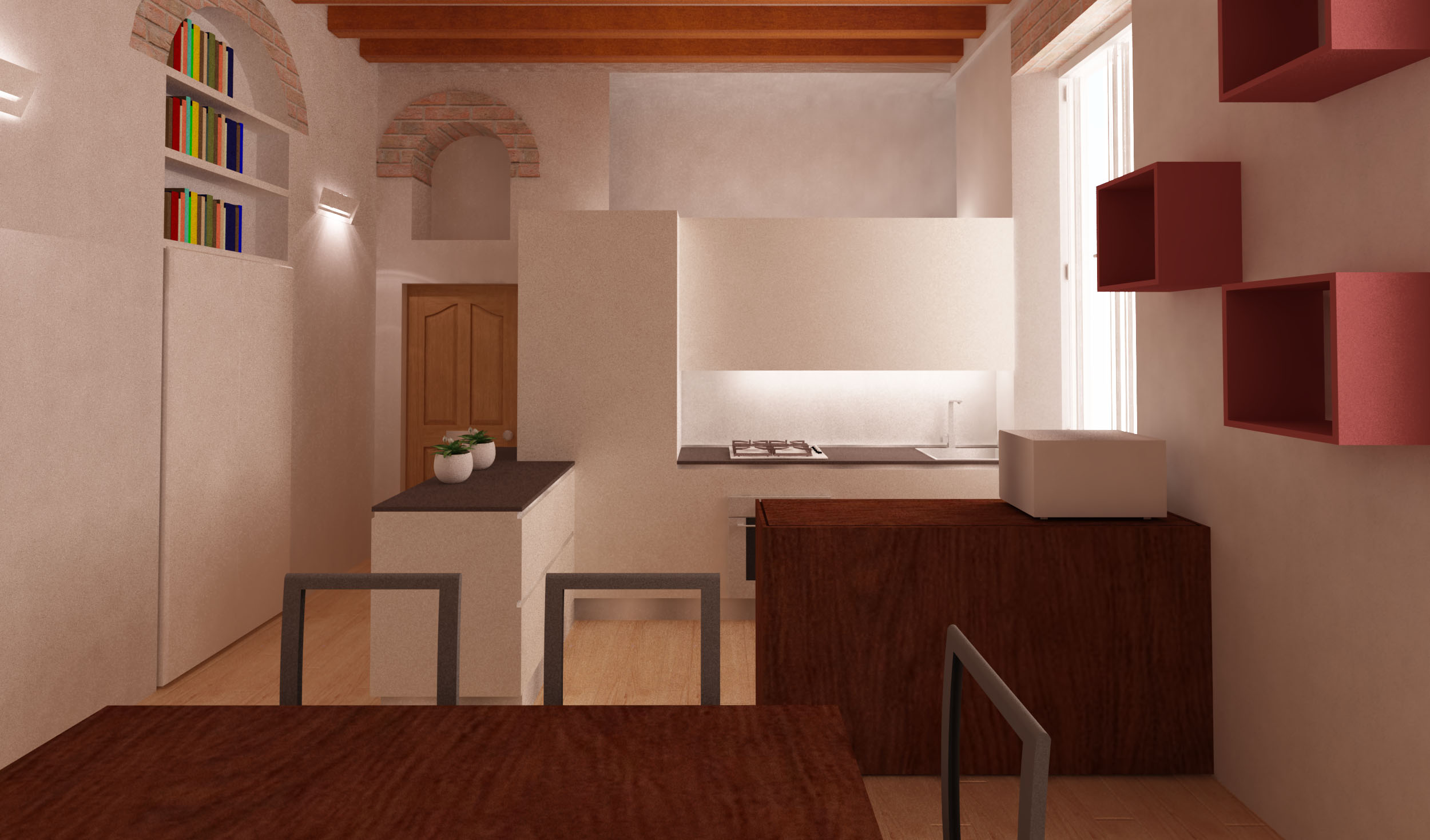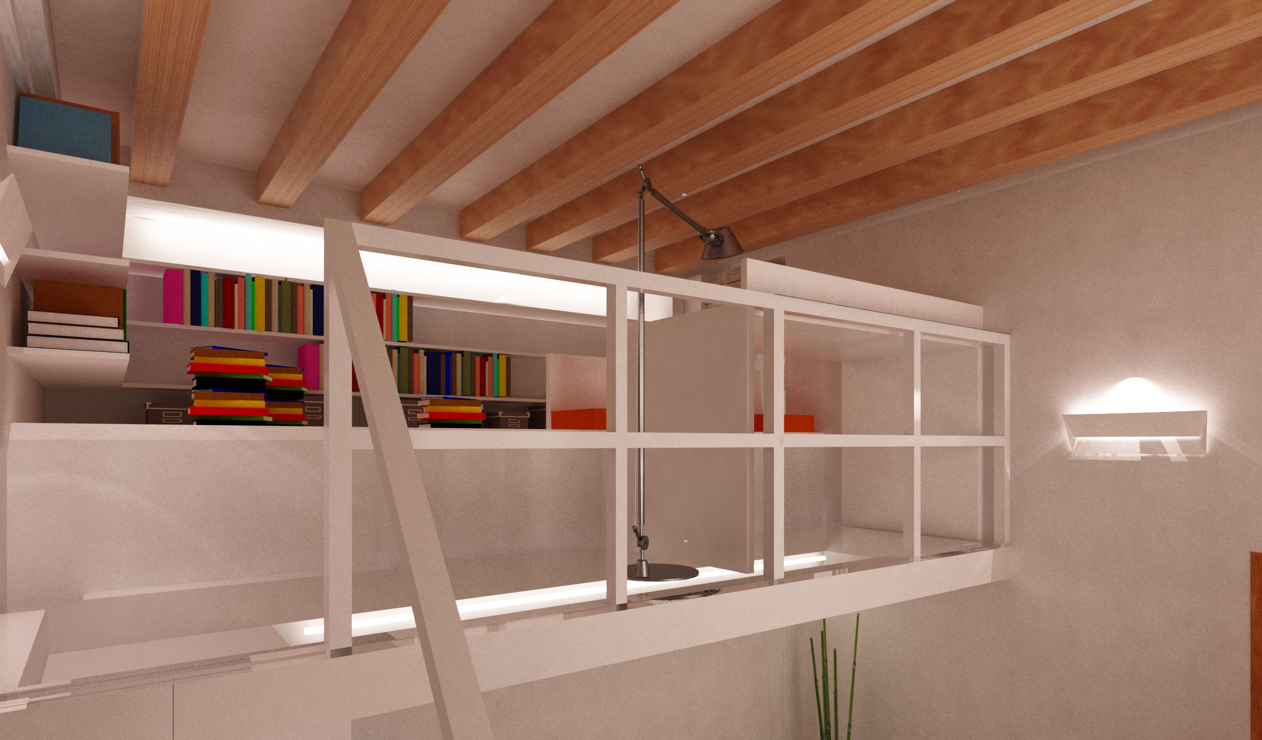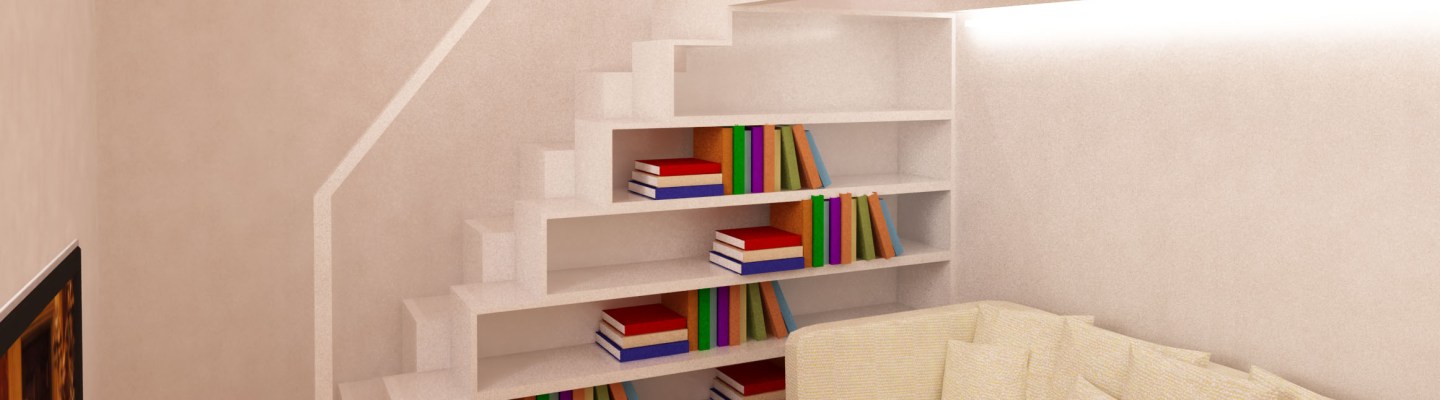 Il salotto si presenta piuttosto piccolo ma una cosa che si vuole sfruttare è l’altezza dei locali che permette di ricavare “in verticale” una zona da dedicare ai libri e al lavoro valorizzando la doppia altezza data dal soffitto del bagno. Si è pensato ad un “soppalco-balcone” in cui posizionare la scrivania.