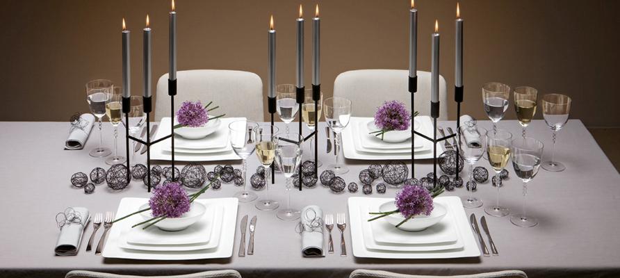 Per allestire la nostra tavola è d’obbligo anzitutto tenere a mente alcuni semplici norme del galateo. La quantità di piatti e posate da disporre sulla tovaglia dipenderà certamente dal menu, ma la loro collocazione deve rispettare qualche regola: a destra di ogni piatto vanno il cucchiaio e il coltello, a sinistra la forchetta e il tovagliolo, nella parte superiore, fra piatto e bicchieri, le posate per la frutta e i dolci. I bicchieri andrebbero disposti nell’ordine in cui saranno serviti i vini. L’immagine qua sotto ci suggerisce una disposizione tipo:  piattino per il pane (1), bicchiere per l’acqua (2), bicchiere da vino rosso (3), bicchiere da vino bianco (4), bicchiere da vino dessert (5), cucchiaio da dolce (6), forchetta da dolce o frutta (7), tovagliolo (8), forchetta 1^ portata (9),  forchetta 2^ portata (10), piatti (11), coltello (12), cucchiaio per la minestra (13).