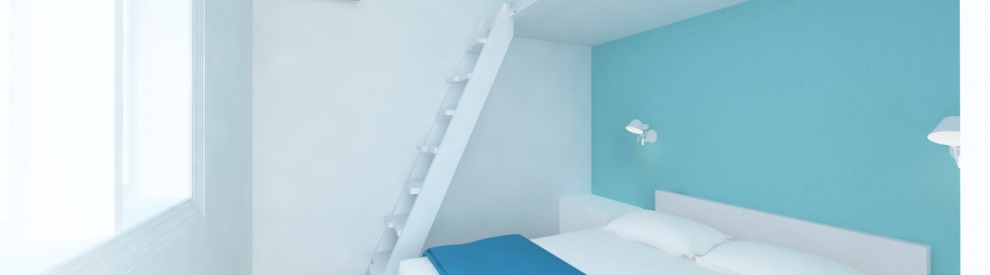 Perchè non utilizzare lo spazio verticale per un guardaroba soppalcato? se abbiamo a disposizione una stanza davvero piccola ma molto alta possiamo creare una stanza piccola ma di design! Lasciamo il letto comodo e soppalchiamo con una passerella solo la zona guardaroba. Per fare ciò ho inserito l’armadio sospeso “Etvoilà” di Lago che essendo fissato a parete grava poco sulla parte soppalcata, una piccola scala a pedata alternata e un gioco di colori tra il tessuto e la parete ingannano l’occhio e uniformano lo spazio…il guardaroba quando è chiuso scompare nel colore! Per il letto ho utilizzato il fluttua che riduce al minimo l’ingombro (il solo materasso), è leggero e molto glamour.