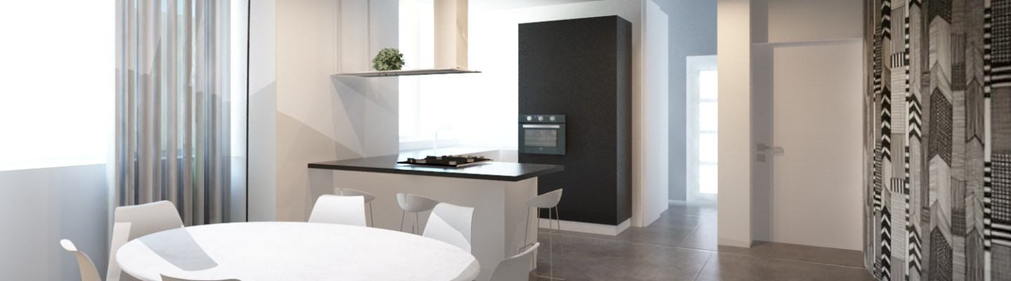 Abbiamo posizionato la zona living spaziosa con cucina a vista e penisola che si apre subito all’ingresso evidenziando la curvatura perimetrale esistente con colore o carta da parati, la curva sarà poi ripresa dal contro-soffitto sopra la cucina. Perciò idealmente in centro abbiamo inserito il living e ai due capi della “elle” la zona notte e il bagno con lavanderia. Avendo inserito Il bagno principale con finestra lontano dalla camera da letto è stato inserito un piccolo bagno privato.