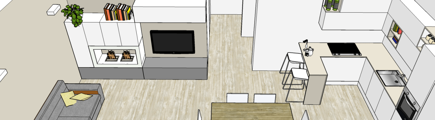 Si tratta di uno spazio di circa 30 mq compreso l’ingresso nei quali rispondere ai seguenti desideri: cucina con angolo snack, tavolo grande in legno, camino/bruciatore, parete in pietra ricostruita, contro-soffitto con faretti, divano grande. Ho cercato di studiare delle soluzioni che esaudissero tutti i desideri ma come spesso accade alle volte bisogna scendere a qualche compromesso.