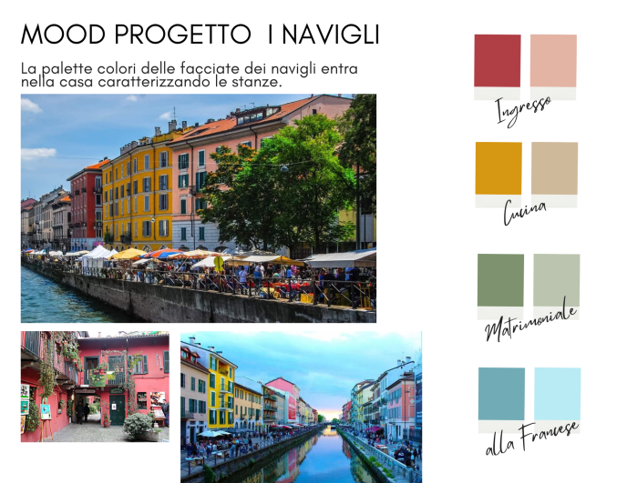 Lo strumento principale di trasformazione è stato il colore seguendo come idea di progetto la continuità e l’accordo cromatico tra il dentro ed il fuori cosi da far vivere appieno agli ospiti lo spirito del naviglio. La zona living a rafforzamento del concept ospita vecchie foto dei Navigli e le cromie caratteristiche degli edifici che si affacciano di esso caratterizzano gli ambienti.