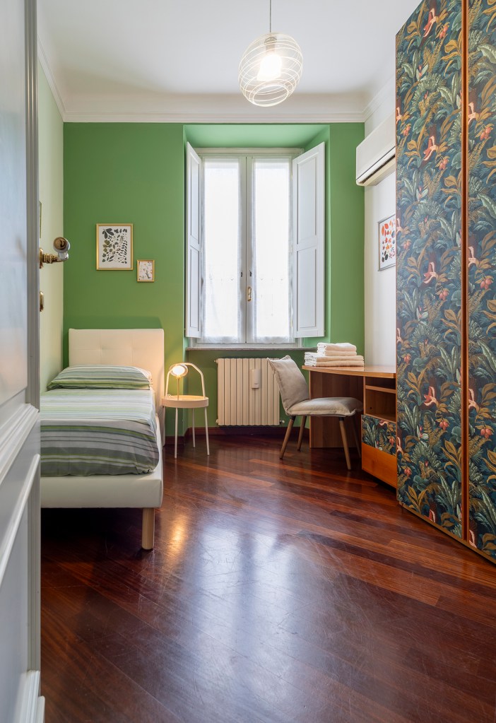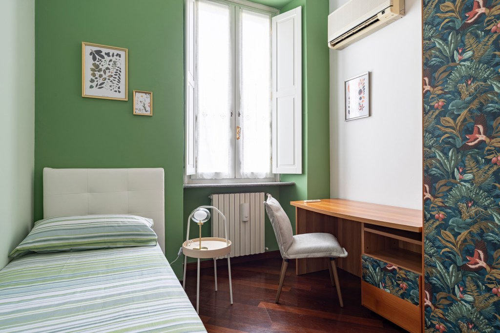 - Il verde acceso alle pareti richiama estetiche moderne e un po’ mid-century