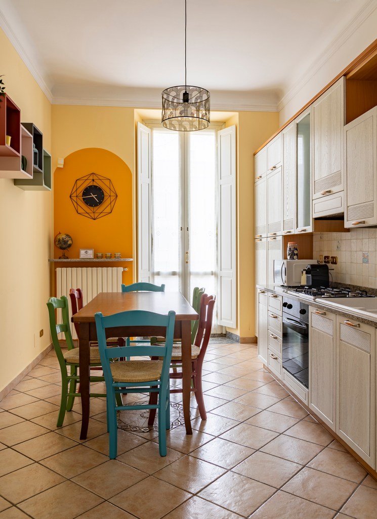 La scelta è ricaduta su un giallo vibrante per le pareti, capace di amplificare la luce naturale e infondere energia immediata. Al centro, il grande tavolo da sei posti è diventato il ‘ponte’ cromatico della casa: ho deciso di attualizzarlo smaltando le sedie con i tre colori guida che definiscono le altre stanze — terracotta, verde salvia e turchese.